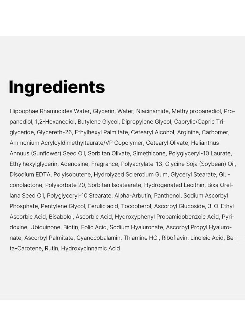 - High Concentration of Active Ingredients: Contains 50% Sea Buckthorn Extract (Vitamin Tree Water), 5% Niacinamide (Vitamin B3), and Pure Vitamin C encapsulated to prevent oxidation.